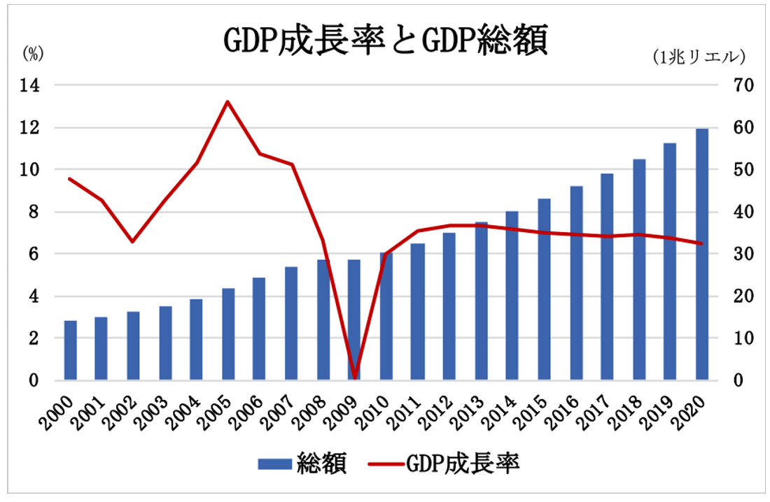 Figure 1. Cambodia GDP Growth Rate (Red) and Total GDP (Blue)